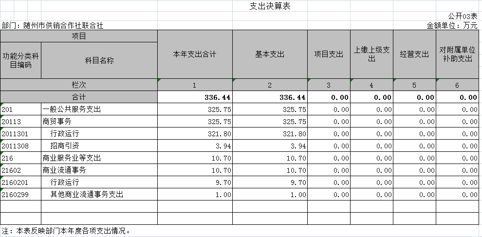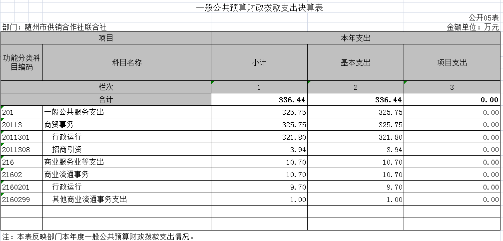 2018年部門支出336.44萬(wàn)元,比2017年368萬(wàn)元減少31.56萬(wàn)元, 減少比率8.58%,減少的主要因素是取消了新農(nóng)村現(xiàn)代流通網(wǎng)絡(luò)建設(shè)工程項(xiàng)目;比年初預(yù)算232.18萬(wàn)元增加104.26萬(wàn)元,增加比率44.9%,增加的主要因素是人員五項(xiàng)獎(jiǎng)勵(lì)工資追加預(yù)算撥款收入。其中:基本支出336.44萬(wàn)元,用于單位正常運(yùn)轉(zhuǎn)的支出。 (三)財(cái)政撥款支出決算情況 2018年財(cái)政撥款支出336.44萬(wàn)元,其中基本支出336.44萬(wàn)元。比2017年339.27萬(wàn)元減少2.83萬(wàn)元,減少比率0.83%,減少的主要因素是退休一名處級(jí)干部,增加一名科員;比年初預(yù)算195.85萬(wàn)元增加140.59萬(wàn)元,增加比率71.78%,增加的主要因素是人員五項(xiàng)獎(jiǎng)勵(lì)工資追加預(yù)算撥款收入。