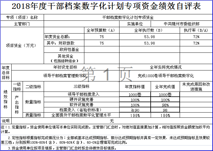 ??干部檔案數字化項目績效自評綜述:項目全年預算數為75萬元,執行數為53.98萬元,完成預算的72%。主要產出和效果:最大限度地開發干部檔案信息資源,全面提升干部人事檔案管理工作信息化、科學化水平,我市1000多名領導干部檔案全部實現了數字化標準管理。發現的問題及原因:年度資金實際支出少于預算金額。主要原因是:項目實施后通過驗收有一定期限,部分資金需后續撥付。下一步改進措施:根據工作進展情況及時撥付相關資金。