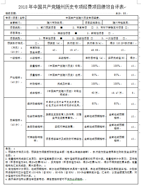 績效自評綜述:項目全年預算數為40.00萬元,執行數為19.47萬元,完成預算48.68%。主要產出和效益:一是《中國共產黨隨州歷史》出版進度達95%,;二是發揮黨史資政育人的作用,加強全市黨史教育宣傳。發現的問題及原因:一是項目預算的準確性不高,二是部門支出財務管理不規范;下一步改進措施:一是要求強化項目管理,二是強化預算執行,三是嚴格執行中央八項規定和省委省政府十項規定精神。