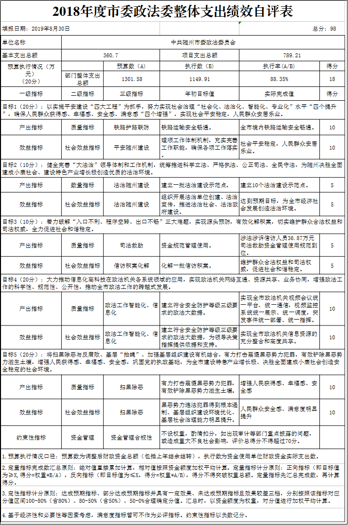 2018年本單位政法智能化建設項目全年預算為600萬元,實際執行數為545.29萬元,完成預算數90.88%。主要產出和效益:初步建成一張縱向貫通、橫向聯通的隨州市政法綜合信息網,建立政法數據中心和集維穩中心、綜治中心、網格中心、視頻會議、指揮調度等為一體的多功能應急指揮平臺,積極配合對接省委政法委信息系統,打造了隨州特色的政法業務支撐體系、政法為民服務支撐體系和安全運維體系,全力推動了政法機關網絡互通、資源整合、信息共享、業務協同。發現的問題和原因:項目績效指標設計需進一步加強,項目績效指標設計多為定性指標,缺乏定量指標;項目管理制度需進一步完善,具體項目支出有待科學規劃。下一步改進措施:在年度預算績效申報時將年度工作任務細化分解為具體的工作目標,采取定量的方式制定清晰、可衡量的績效指標,并通過完善制度管理來協調項目建設,保證項目長遠目標的貫徹執行和預定目標的實現。