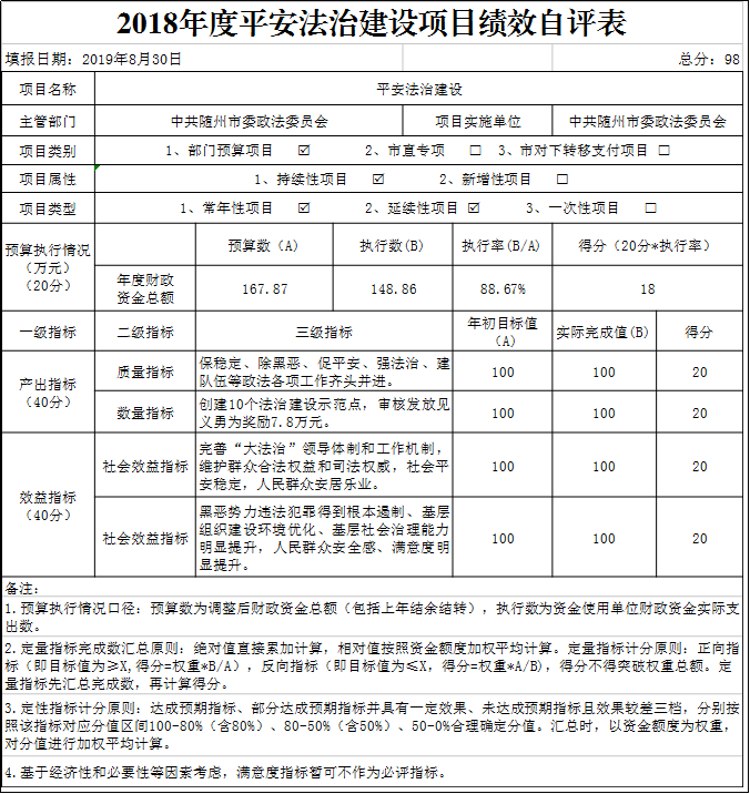2018年平安法治建設項目全年預算數為171萬元,實際下達167.87萬元,實際執行數為148.86萬元,完成預算88.67%。主要產出和效益:圓滿完成一系列重大活動和敏感期維穩安保任務,維護了社會大局安全穩定;全面打造立體化治安防控體系,社會綜合服務治理能力倍增;全面筑牢法治政府根基、維護了公正司法效力、增強法治信仰意識;政法隊伍建設邁上新臺階,不斷筑牢忠誠可靠的政治本色,強化敢打必勝的戰斗底氣,確保履職盡責的內在動力;全面開展掃黑除惡專項斗爭,不斷增強了人民群眾獲得感、幸福感、安全感、滿意感。發現的問題和原因:項目績效指標設計多為定性指標,缺乏定量指標;項目管理制度需進一步完善,具體項目支出有待科學規劃。下一步改進措施:及時調整優化延續項目及下一年度預算支出的方向和結構,進一步加強財務管理,規范資金使用,提高年度項目經費預算執行率。同時,在年度預算績效申報時將年度工作任務細化分解為具體的工作目標,并盡量采取定量的方式制定清晰、可衡量的績效指標,進一步提高績效自評可操作性。