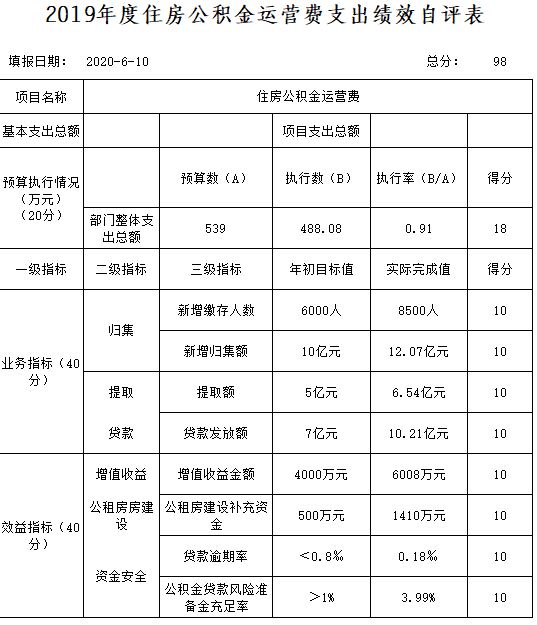 項目全年預(yù)算數(shù)為539萬元 ,執(zhí)行數(shù)為488.08萬元 ,完成預(yù)算 90.55 % 。主要產(chǎn)出和效益 :一是繳存,全年新開戶單位188家,新開戶職工0.85萬人;繳存額12.07億元,同比增長13.12%。二是提取,全年提取額6..54億元,同比增長1.08%。三是貸款,全年放個人住房貸款0.30萬筆10.21億元,同比分別持平、增長19.14%。三是資金運用率,2019年末,住房公積金個人住房貸款余額、項目貸款余額和購買國債余額的總和占繳存余額的92.67%,比上年增加2.61個百分點。四是增值收益,全年實現(xiàn)增值收益6007.87萬元,同比增長22.60%。增值收益率1.78%,比上年增長0.08個百分點。