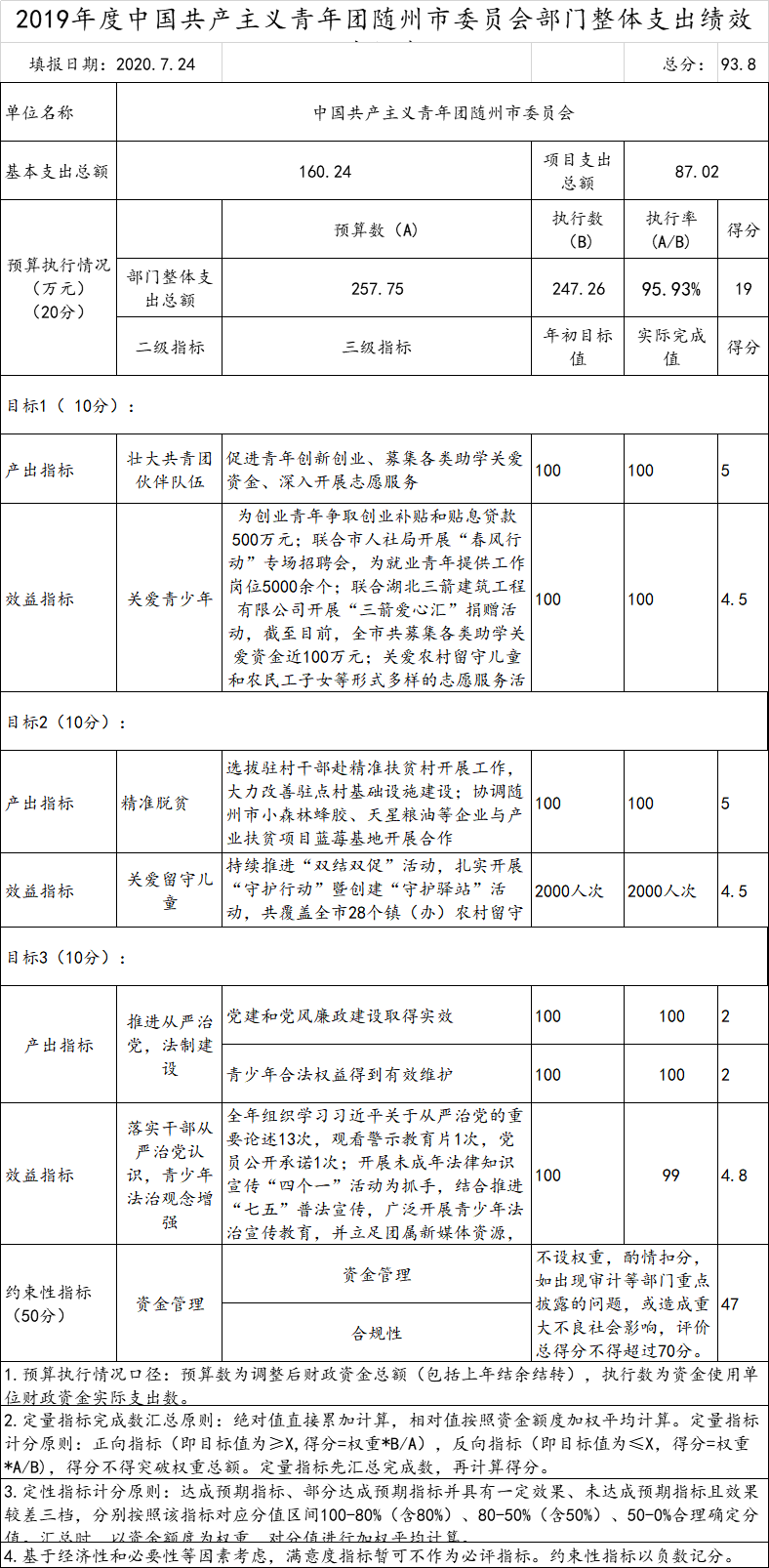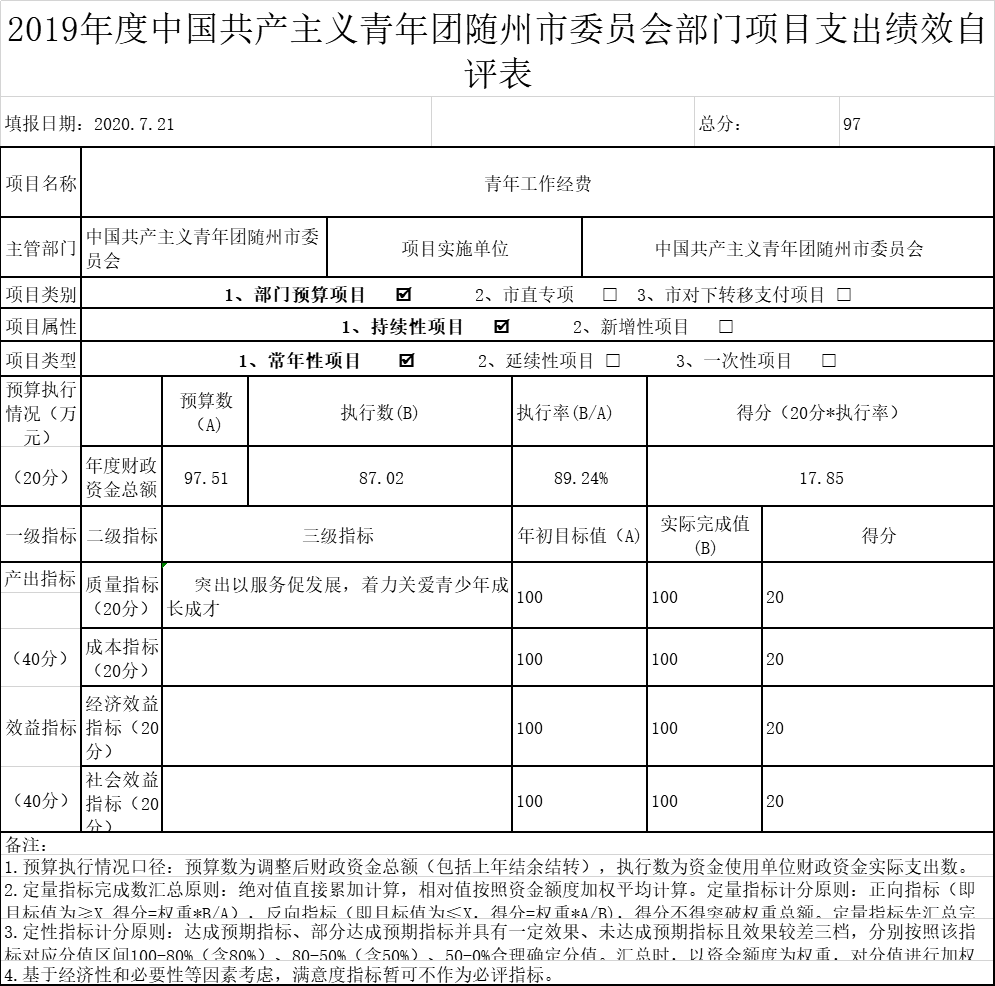 2019年我單位預算項目1個,項目名稱為:青年工作經費。2019年項目預算數共計97.51萬元,2019年項目實際支付數87.02萬元,執行率率為89.24%。我單位2019年無預算調整,年初我單位共預算1個項目,青年工作經費項目已按項目完成進度支付,資金管理、費用標準及支付均符合相關制度的規定,支付手續齊全、憑證合法、有效。