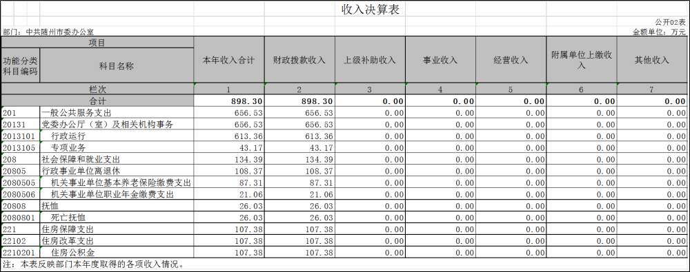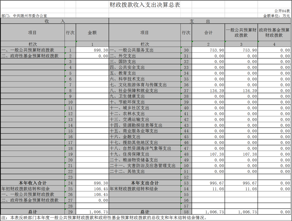 市委辦2019年度預算財政撥款收入預算為519.74萬元萬元,實際收到的一般公共預算財政撥款收入為898.3萬元(追補的為審核撥付的獎勵性工資及機構改革人員變動、調資和離休老干部醫(yī)療費撫恤金等);財政部門撥款對賬單898.3?萬元,無差額?。全年財政撥款支出995.67萬元,比上年的總支出683.3萬元增加312.38萬元,主要是機構改革人員變動、調資等原因。