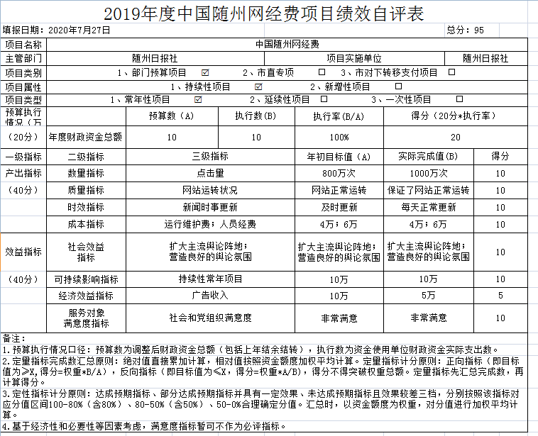 我單位對兩個項目進行了績效自評,分別為中國隨州網經費和贈報費。年初預算數分別為10萬元和15萬元,全年執行數共計25萬元,完成預算的100%。項目主要效果:一是擴大了主流輿論陣地,為我市經濟和發展營造良好的輿論氛圍。二是擴大主流媒體影響力和公信力。三是更好的服務讀者、服務社會。