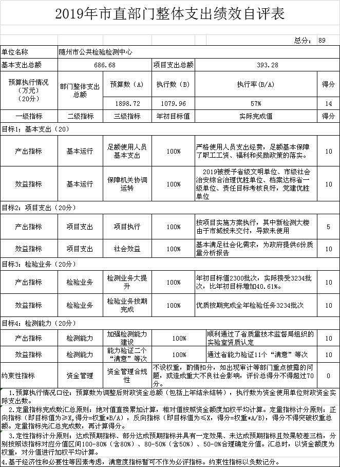組織開展部門整體支出績效評價,評價情況來看,總分為89分,扣11分,主要為二項,第一項是預算執行情況:年度總預算1898.72萬元,實際執行總支出1,079.96萬元,執行率57%,此項扣6分。第一項合計扣6分。第二項為項目支出指標中完成情況:按項目實施方案執行,執行率僅36.71%。未達到的一項是未啟用檢測大樓。此項指標扣5分.
