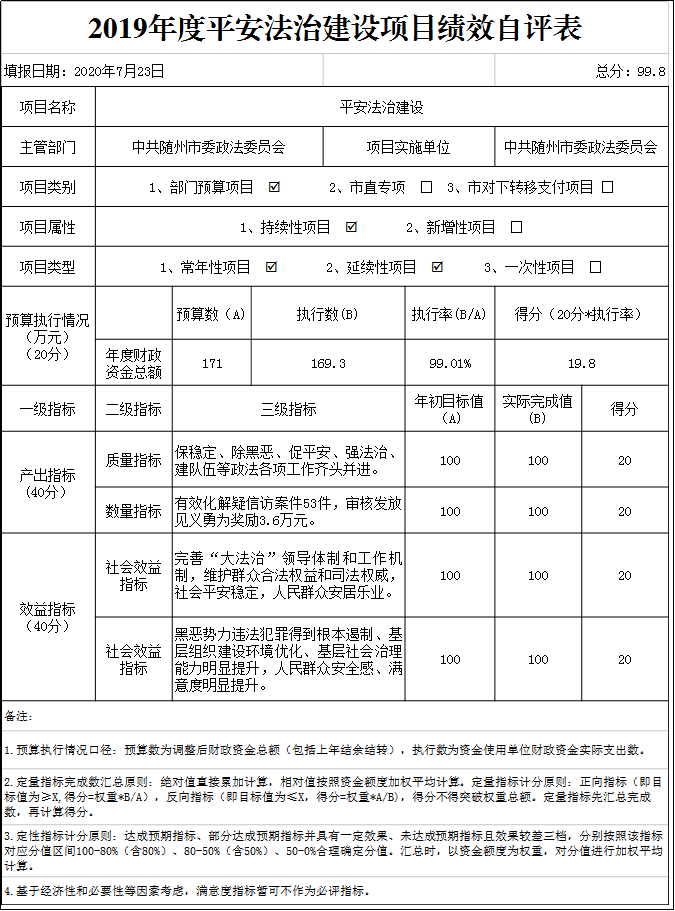 附件:2019年度平安法治建設項目績效自評表