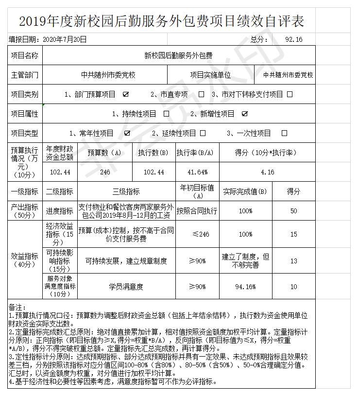 “新校園后勤服務外包費”為新增項目,通過招標,餐飲客房中標人為隨州市飲食旅游服務總公司,中標價為170萬元,物業管理中標人為隨州市瑞庭物業管理有限公司,中標價為75.85萬元。 該項目預算金額為246萬元,但需要審核撥付,黨校自2019年8月搬至新校園,向財政申請下達金額只能是8至12月的合同金額。按合同需要付102.44萬元,黨校申請且財政下達102.44萬元,支付102.44萬元,執行率為41.64%。按照合同執行,支付了應付服務費。