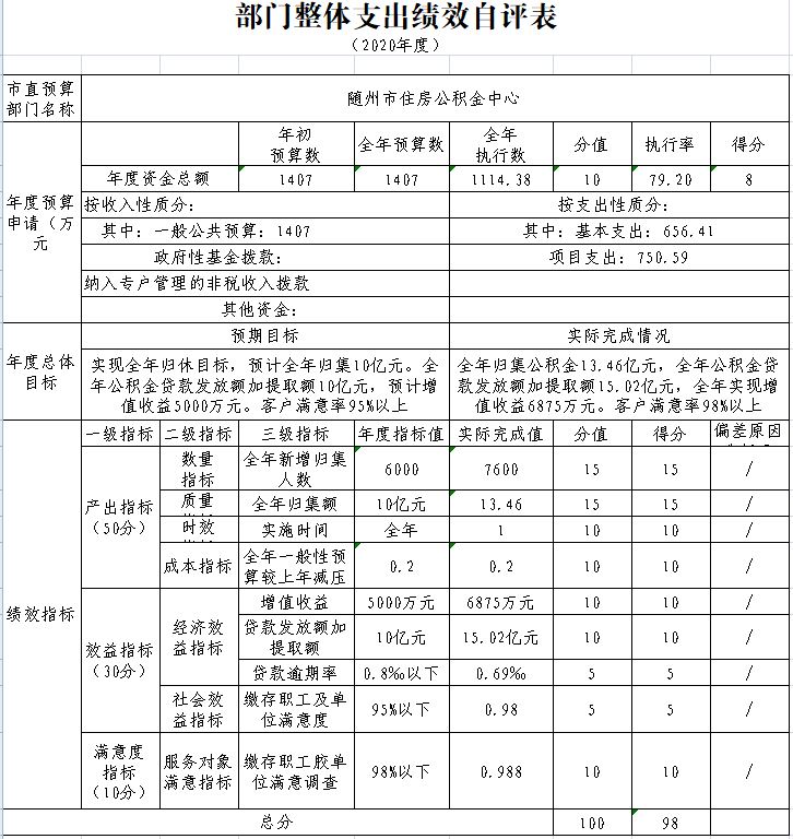 項目全年預算數為494.59萬元?,執行數為452.80萬元?,完成預算?91.55 %?。主要產出和效益?:一是全市住房公積金新增擴面7573人,完成省住建廳下達年度擴面任務2000人的378.65%,完成市政府下達年度擴面任務6000人的126.22%;新增建制單位171家,完成市政府年度單位擴面任務100家的171%;二是新增歸集13.46億元,完成省住建廳下達年度歸集額任務9.5億元的141.63%,完成市政府下達年度歸集額任務10億元的134.6%;三是辦理住房公積金提取7.47億元,完成市政府下達年度提取任務5億元的149.32%;四是發放住房公積金貸款7.55億元,完成省住建廳下達年度貸款任務6億元的125.85%,完成市政府下達年度貸款任務7億元的107.87%;個貸率85.43%,達到80%以上;五是逾期率0.69‰,低于省住建廳公積金貸款逾期率0.8‰控制目標;六是實現住房公積金增值收益6875萬元,完成省住建廳下達年度任務3500萬元的196.43%,完成市政府下達年度任務5000萬元的137.5%。