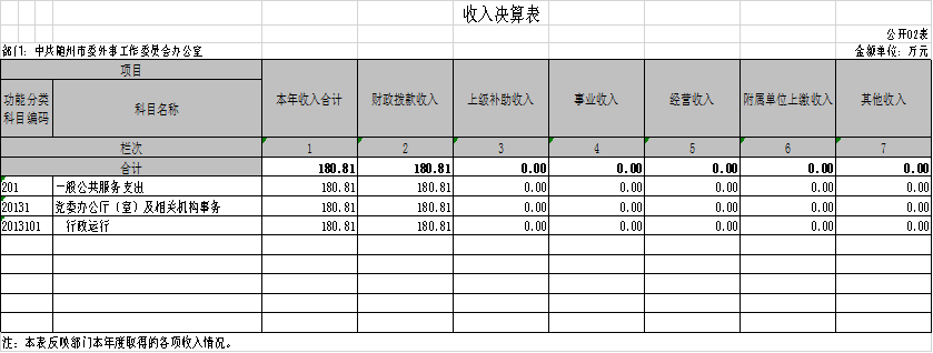 本部門2020年度收入決算180.81萬元,其中財政撥款收入決算180.81萬元,占比100%。由于我單位2019年機構改革新組建單位,無2019年決算數據,無上年對比數。