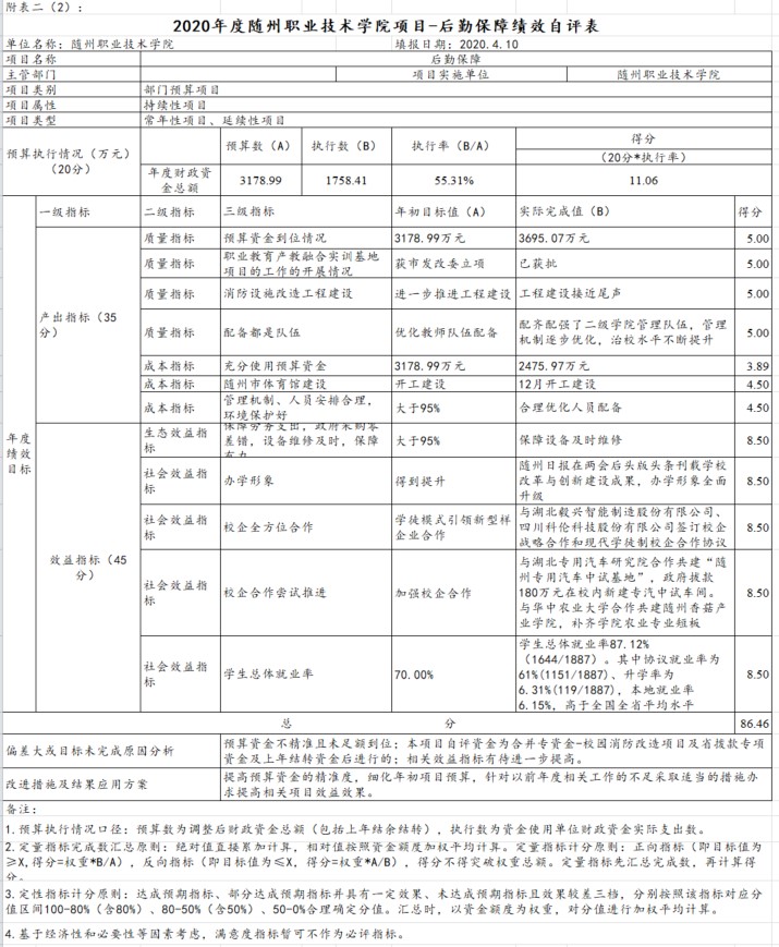 根據(jù)預(yù)算績(jī)效管理要求,我單位組織人員對(duì)2020年度一般公共預(yù)算項(xiàng)目支出全面開展績(jī)效自評(píng),共涉及項(xiàng)目2個(gè),資金107萬(wàn)元,占一般公共預(yù)算項(xiàng)目支出總額的100%。經(jīng)評(píng)價(jià),項(xiàng)目支出自評(píng)平均得分98分,后勤保障、教學(xué)保障項(xiàng)目正常開展實(shí)施,資金按規(guī)定用途使用。