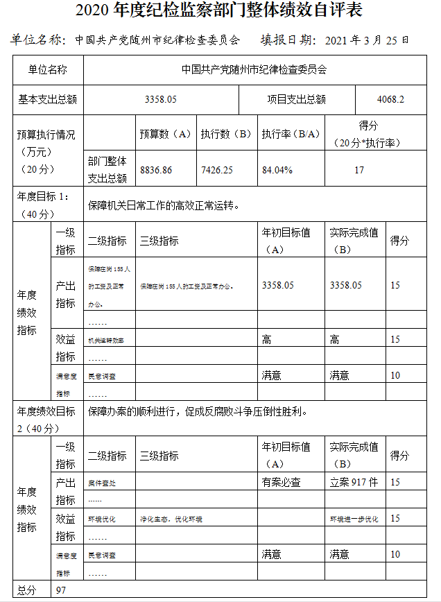 綜上,2020年度我委整體支出績(jī)效自評(píng)得分為97分。財(cái)政委托中介進(jìn)行評(píng)價(jià),等級(jí)為優(yōu)。