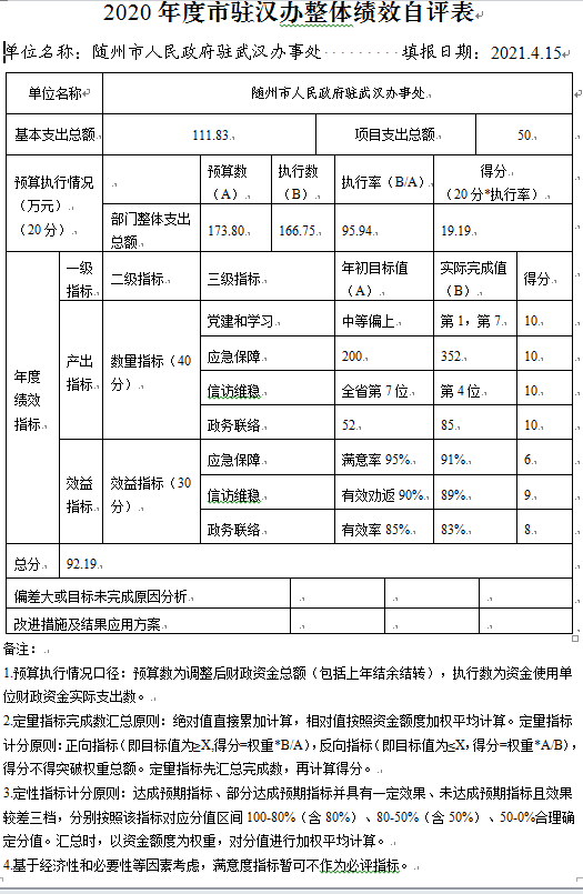 2020年隨州市駐漢辦事處整體績效自評結果最終得分為92.19分。