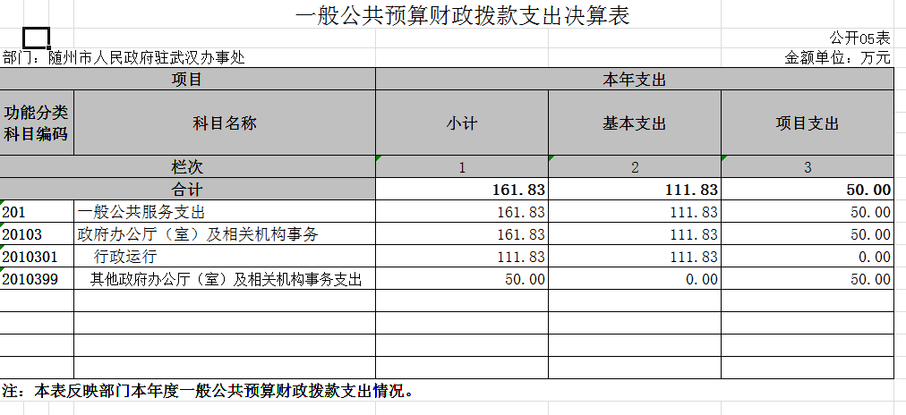 一般公共服務(類)行政運行(項):指市駐辦事處用于機關正常運轉的公務費用,包括辦公費、水費、電費、郵電費、物業管理費、差旅費、維修費、公務接待費、勞務費、工會經費、公務用車運行維護費等機關其他商品和服務支出。