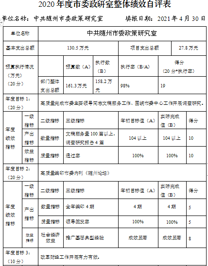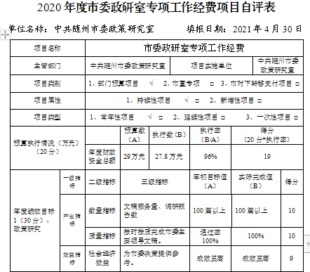 根據(jù)預(yù)算績效管理要求,本部門組織對2020年度一般公共預(yù)算項目支出全面績效自評,共涉及項目1個,資金27.8萬元,占一般公共預(yù)算項目支出總額100%。從評價情況來看,2020年度“政府政研專項工作經(jīng)費”項目績效自評得分:97分,結(jié)果為“良”。