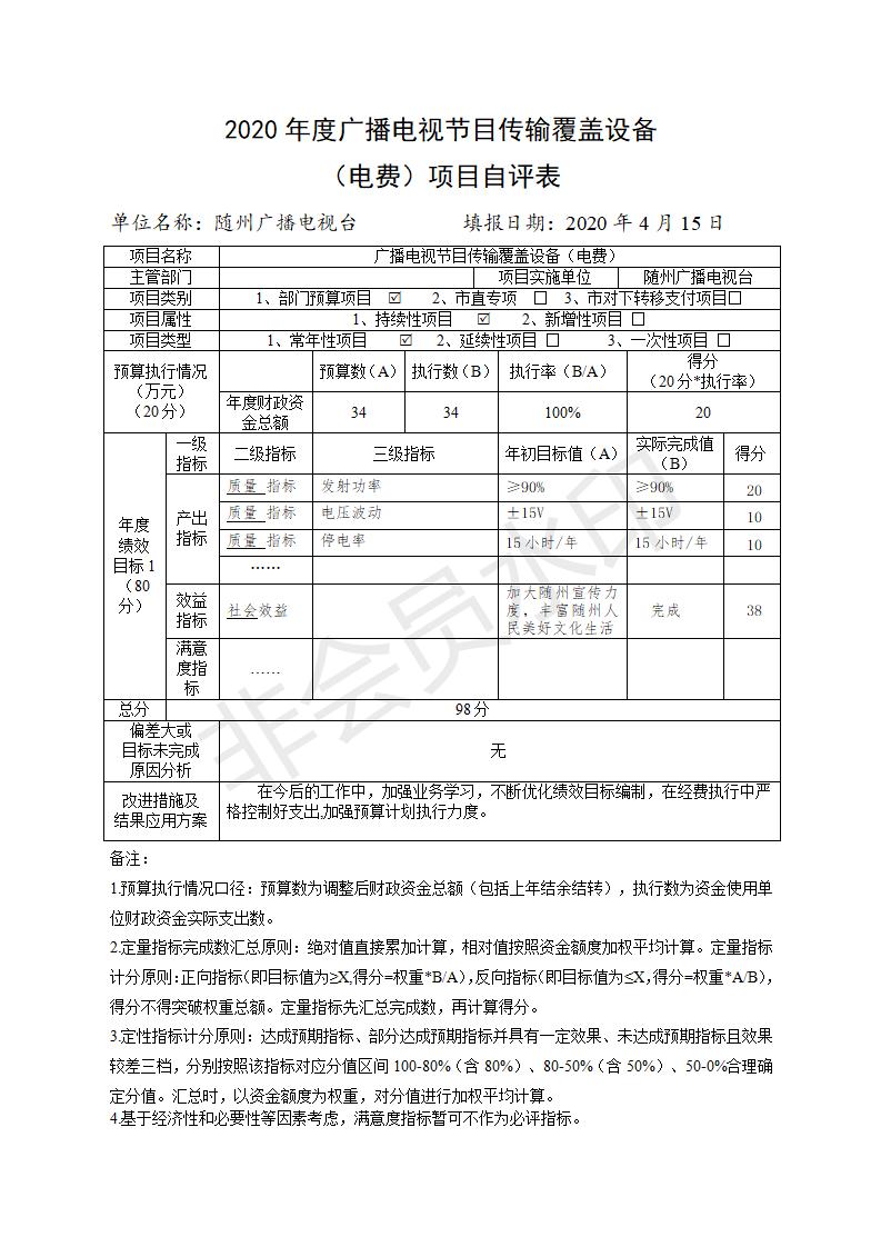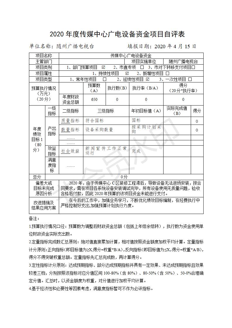 根據預算績效管理要求,隨州廣播電視臺組織對2020年度一般公共預算項目支出全面開展績效自評,項目預算安排資金合計749萬元,由于傳媒中心C區裝修進度停滯,設備無法進場安裝,導致傳媒中心廣電設備資金650萬元項目未執行,該筆經費預算未下達指標,此次績效自評共涉及4個項目,資金99萬元,占一般公共預算項目支出總額的13.22%。從評價情況來看,項目經費管理規范,資金均按規定用途使用,各項目績效目標基本完成,項目立項程序完整、規范,績效目標明確,社會效益較好,項目可持續性強,資金撥付審批程序嚴格,使用規范,投入有保障,會計核算真實準確。