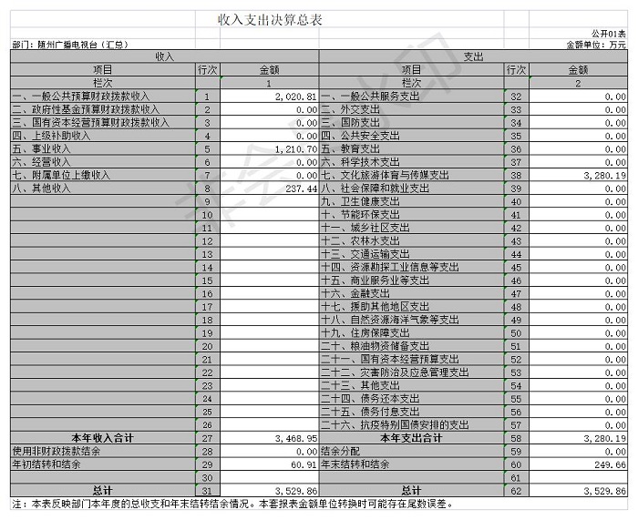 隨州廣播電視臺系統匯總2020年度收入合計3529.86萬元[較2019年度決算收入(4239.29萬元)減少709.43萬元,減少了16.73%,原因是2020年減少了省級專項資金190.59萬元,且2019年度決算收入中含年初結轉和結余516.2萬元。與2020年度預算收入合計(3793.26萬元)相比減少了263.4萬元,減少了6.94%]。其中財政撥款2020.81萬元,較2019年(2043.97萬元)減少了23.16萬元,主要原因是減少了傳媒中心廣電設備資金;事業收入1210.7萬元;其他收入237.44萬元;上年結轉60.91萬元。