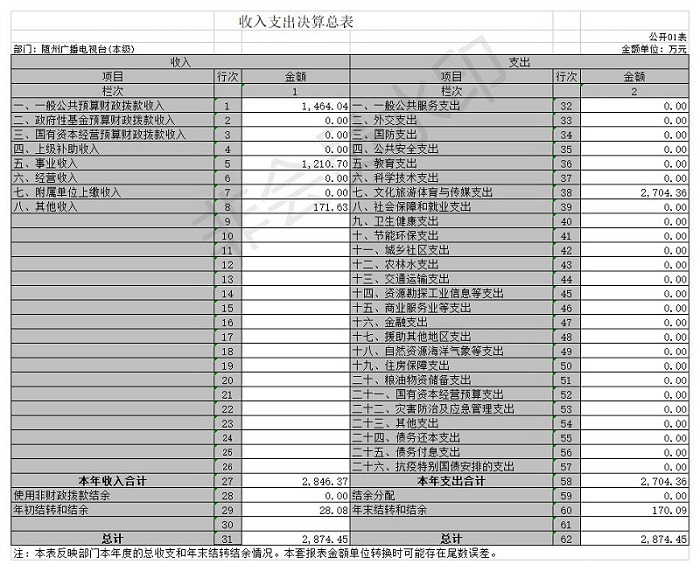 隨州廣播電視臺(本級)2020年收入合計2874.45萬元[較2019年(3173.38萬元)減少298.93萬元,減少9.42%,主要原因是減少了省級專項資金190.59萬元,事業收入減少100.93萬元,和2020年預算(3019.91萬元)相比減少了145.46萬元,減少4.82%]。其中財政撥款1464.04萬元,較2019年(1463.65萬元)增加了0.39萬元,增加原因是將省級專項資金計入財政撥款,事業收入1210.7萬元,其他收入171.63萬元;上年結轉28.08萬元。