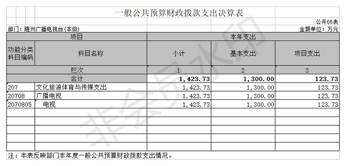 隨州廣播電視臺(本級)2020年度支出合計2704.36萬元,較上年(3145.31萬元)減少440.95萬元,減少14.02%,主要是2020年度傳媒中心廣電設備資金因裝修工程進度滯后,設備無法進場導致未進行支付,與2020年預算(3019.91萬元)相比減少315.55萬元,原因是傳媒中心演播區域裝修進度滯后,設備無法進場導致未進行支付廣電設備預算資金。其中基本支出2575.42萬元,項目支出128.95萬元。