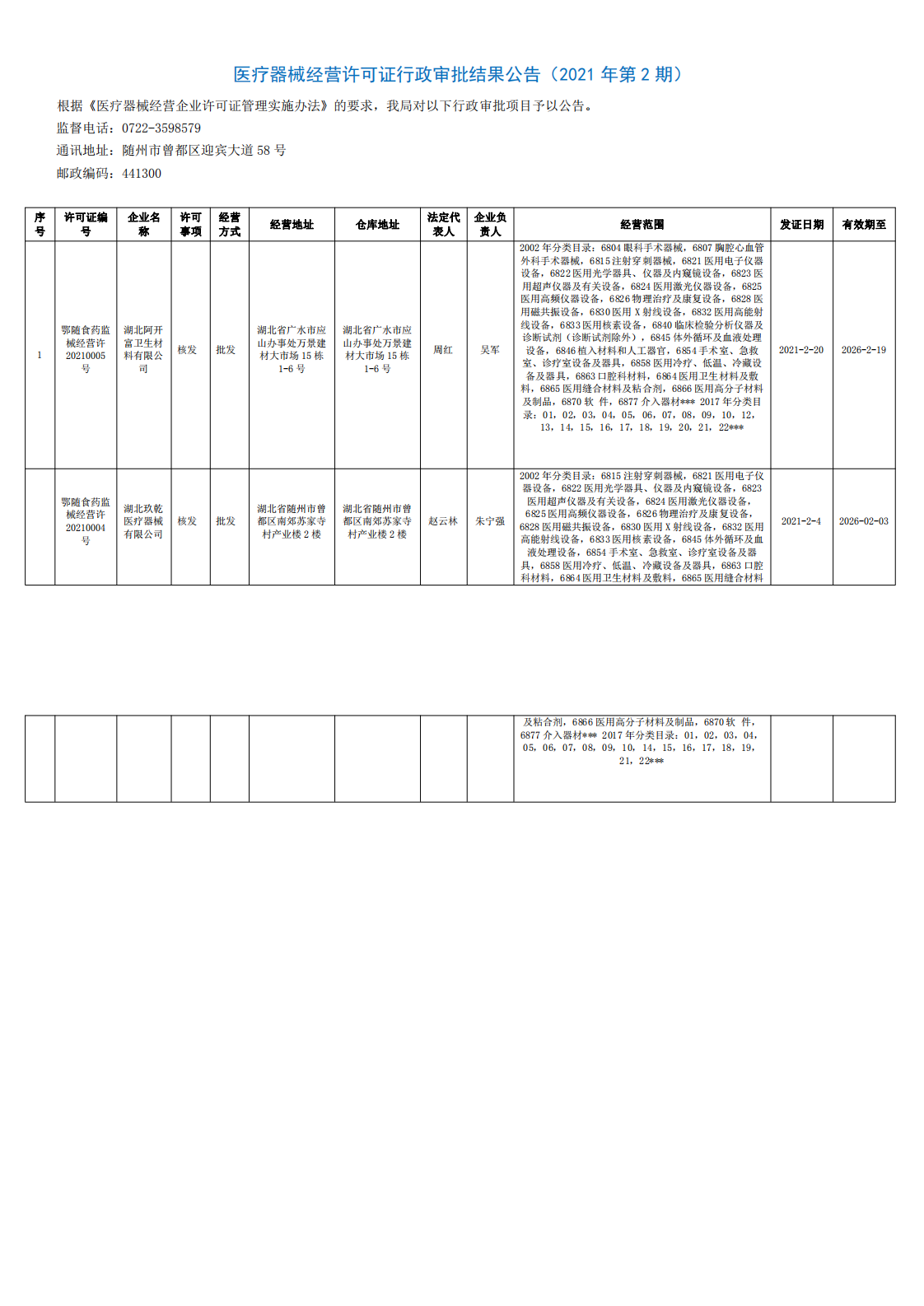 隨州市市場監管局2021年2月三類醫療器械行政審批結果公告