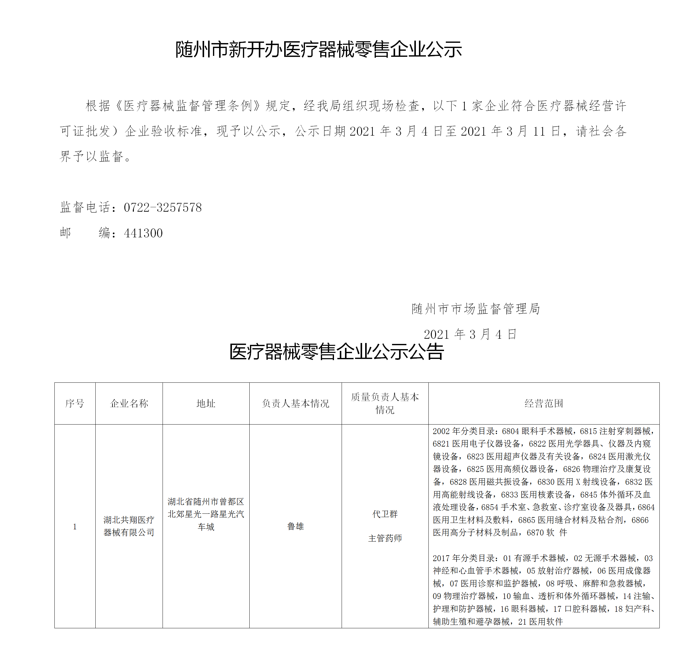 隨州市新開辦醫(yī)療器械零售企業(yè)公示(湖北共翔醫(yī)療器械有限公司)