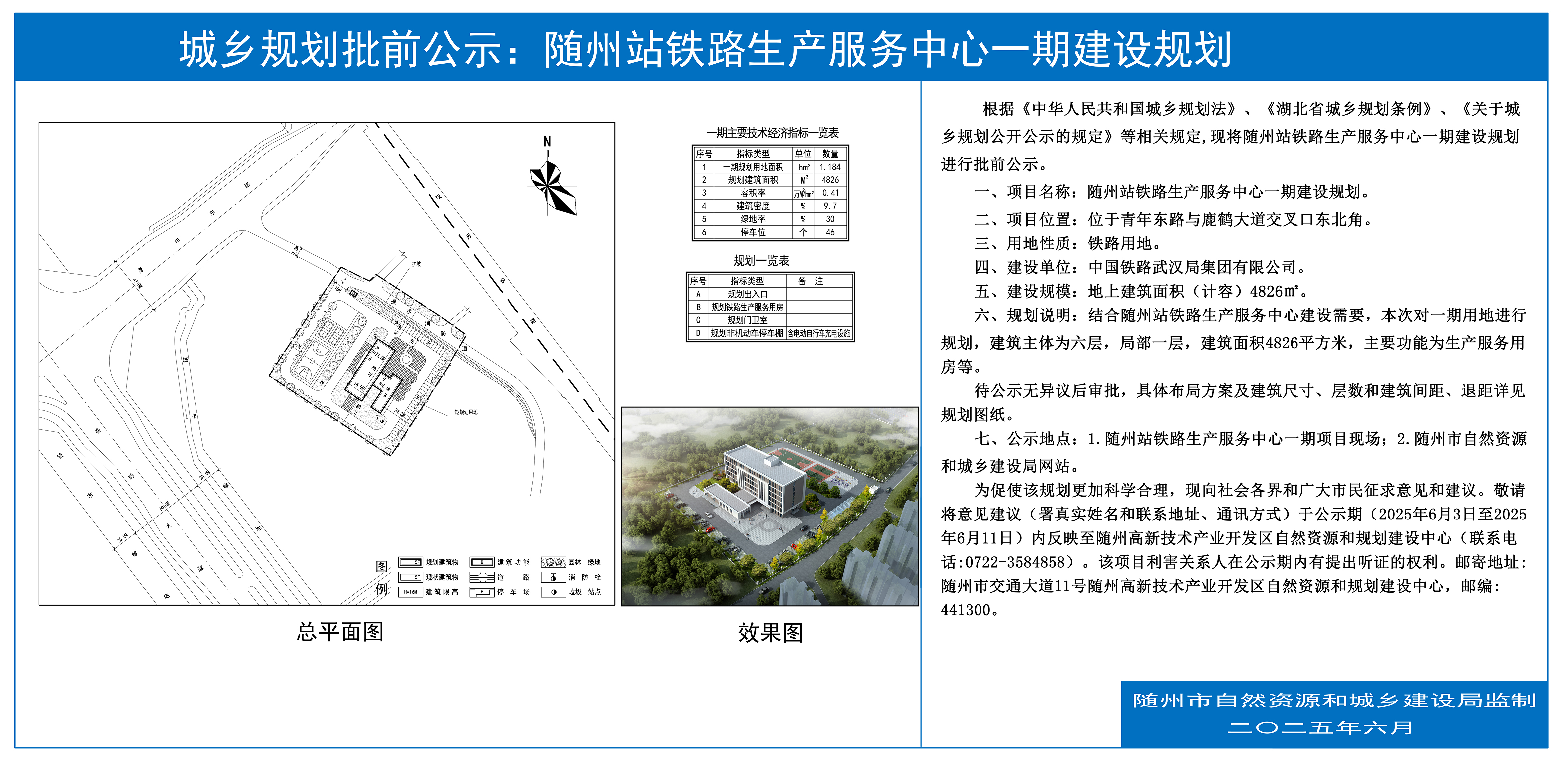 城鄉規劃批前公示:隨州站鐵路生產服務中心一期建設規劃