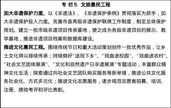 完善公共文化服務體系,提高公共文化體育服務產品供給質量,促進公共文化服務向街道、社區、鄉村延伸,努力實現公共文化服務的社會化、均等化,增強本地居民的獲得感和幸福感。加大文藝精品創作力度,推動非物質文化遺產創造性轉化、創新性發展,豐富文化產品供給,不斷滿足全體市民日益增長的美好生活需求。著力完善城市休閑空間、豐富城市旅游休閑產品,打造濱水、休閑、購物、花卉、工業、鄉村、美食、研學、養老等九大產品體系,持續開展“隨州人游隨州”等惠民活動。扶持貧困群眾開展旅游創業就業,積極探索以旅游資源、扶貧資金等入股參與旅游開發,讓貧困群眾從旅游業發展中獲得穩定收益。