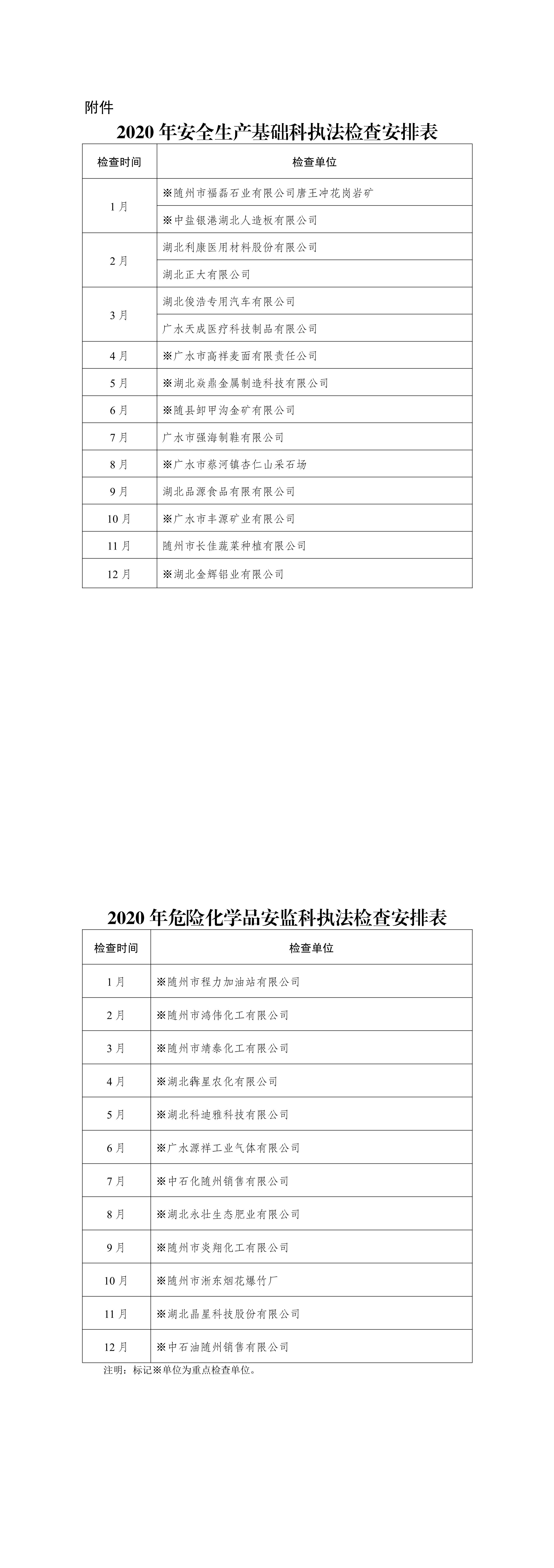為進一步加強安全生產依法行政工作,規范安全生產監督檢查行為,不斷提高行政執法人員工作水平,根據《安全生產法》第五十九條第二款、《安全生產監管監察職責和行政執法責任追究的暫行規定》(原國家安監總局令第24號)和《安全生產年度監督檢查計劃編制辦法》(原安監總政法〔2017〕150號)等要求,結合我市安全生產監管實際,編制《2020年隨州市安全生產監督檢查工作計劃》。