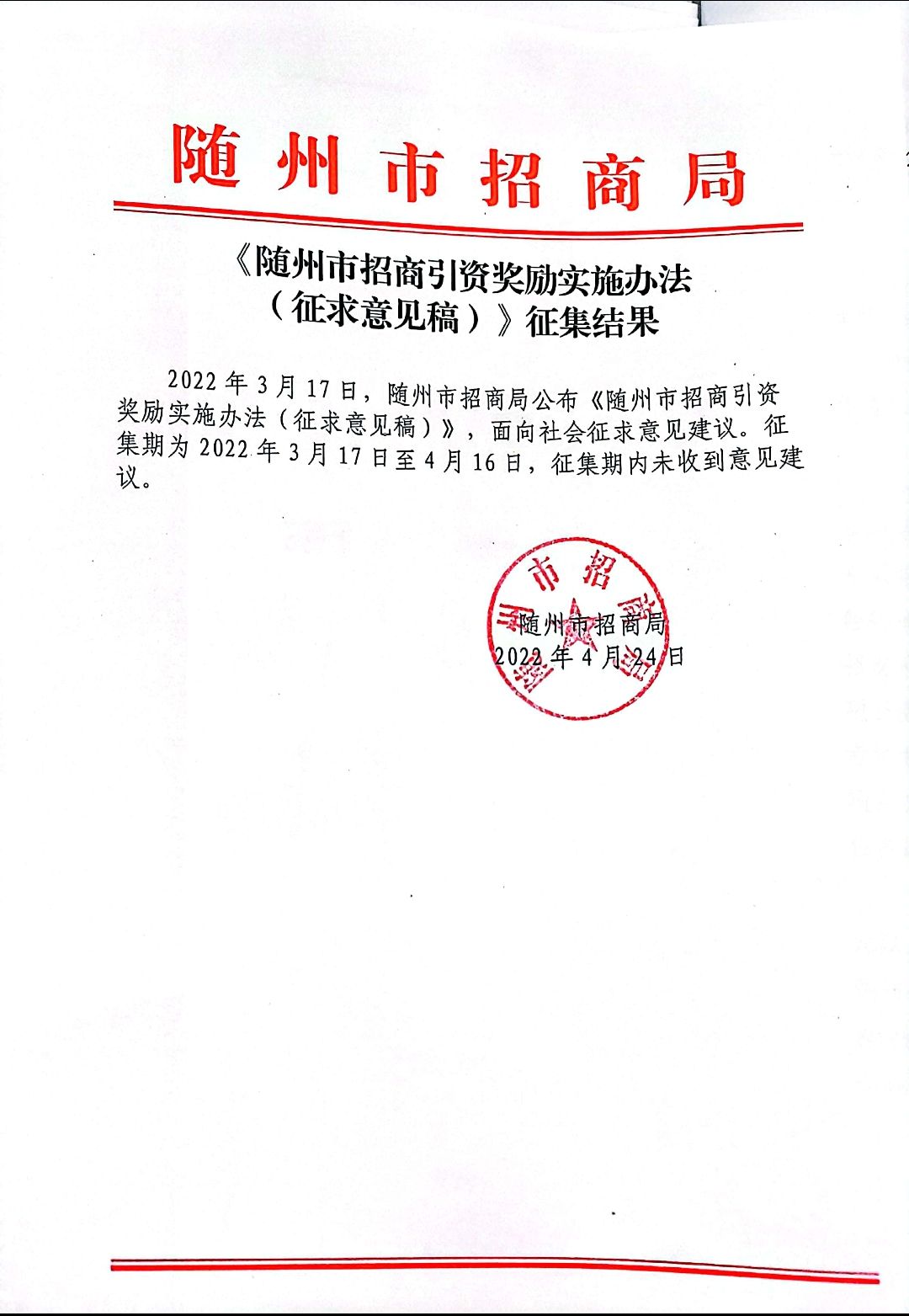 2022年3月17日,隨州市招商局公布《隨州市招商引資獎勵實施辦法(征求意見稿)》,面向社會征求意見建議。征集期為2022年3月17日至4月16日,征集期內(nèi)未收到意見建議。