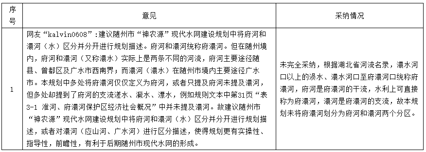 ? ? 《隨州市“神農源”現代水網建設規劃》征求意見及采用情況如下: