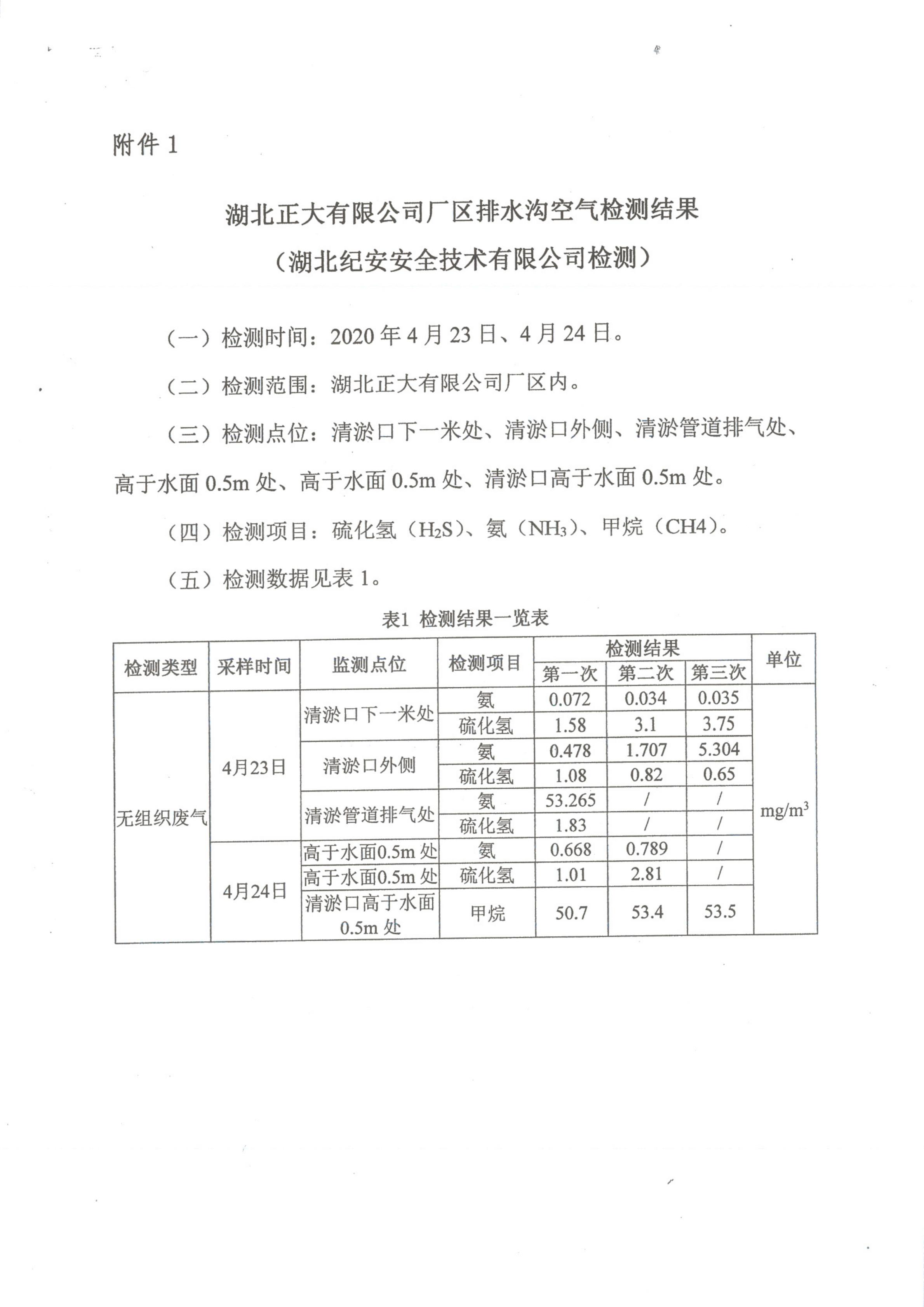 附件:1、湖北正大有限公司廠區排水溝空氣檢測結果