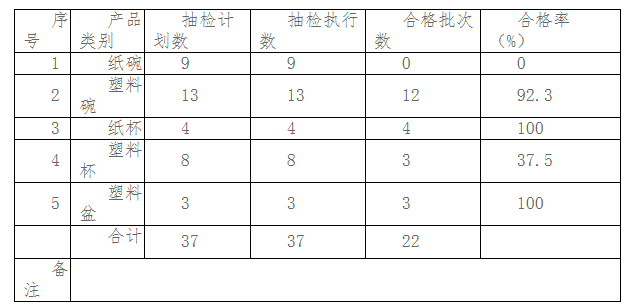 按照專項監督抽查計劃共抽取食品包裝材料37批次產品,其中紙碗類9批次、塑料碗類13批次、紙杯類4批次、塑料杯類8批次、塑料盆類3批次。在抽查的37批次產品中,合格產品22批次,產品質量合格率為60%,不合格產品15批次,不合格率為40%;抽樣過程中發現涉嫌違法產品2批次按程序移交屬地市場監督部門處理。