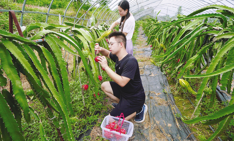 果園里,游客們三五成群,興致盎然地采摘火龍果。他們手握剪刀,小心翼翼地采摘下一顆顆色澤鮮艷、果形飽滿的火龍果。不一會兒,便收獲了滿滿一籃。