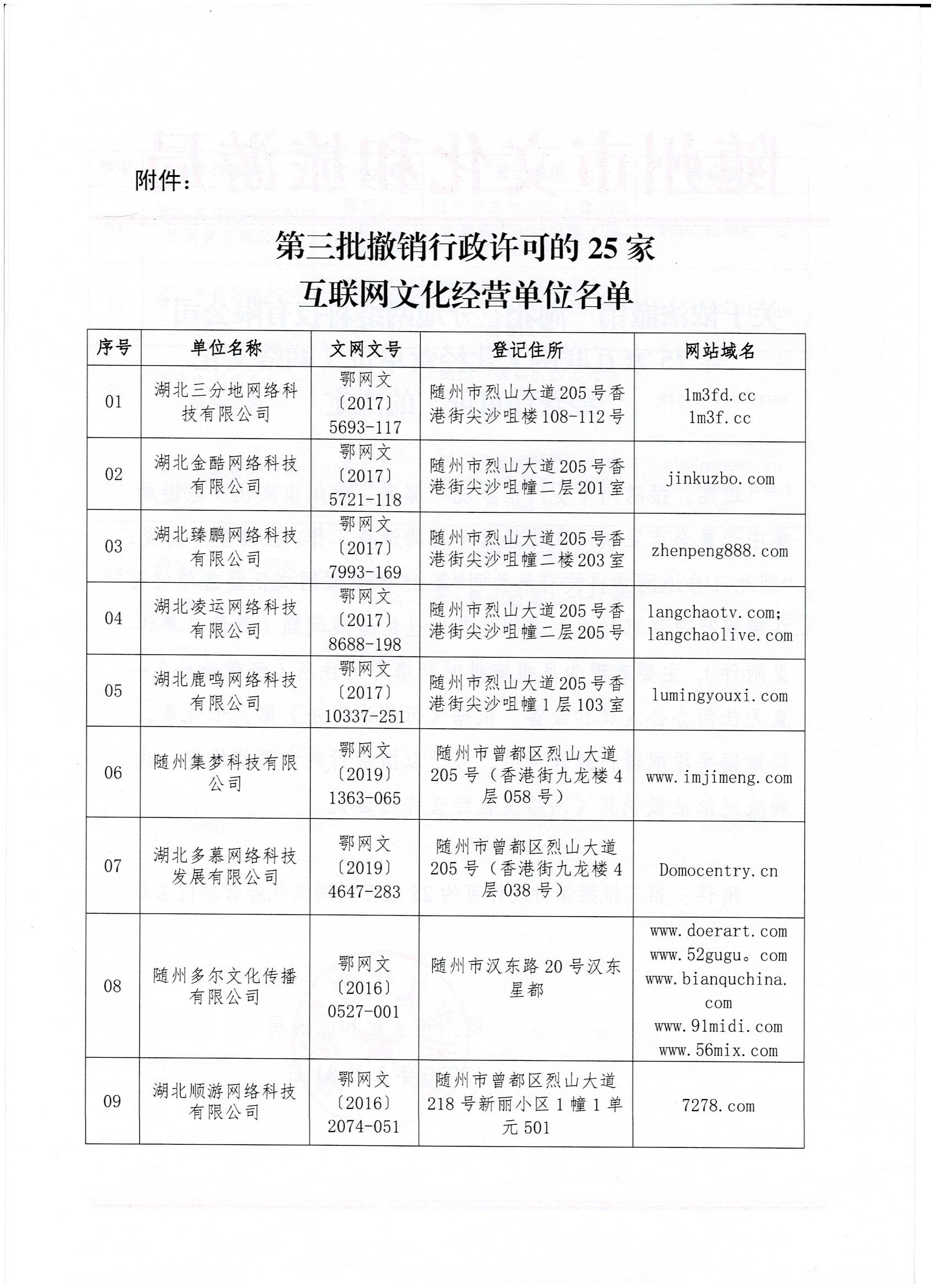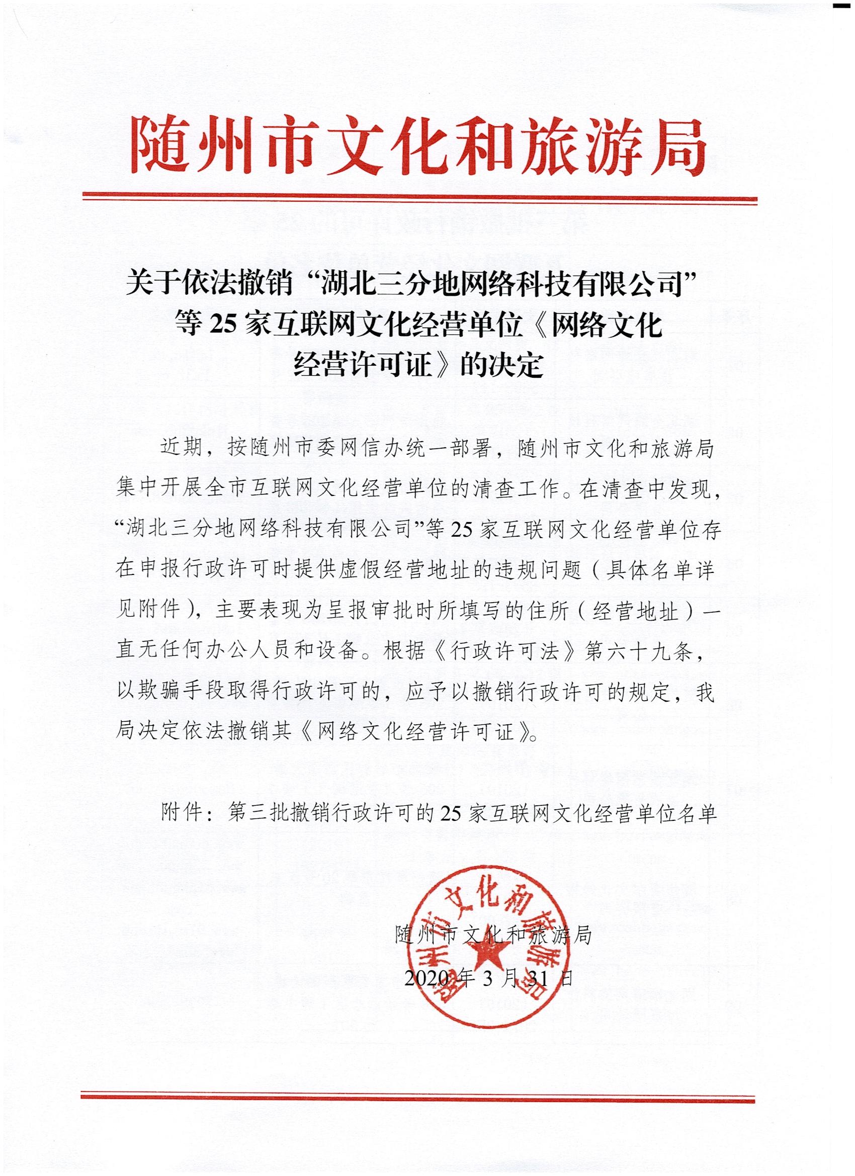 關于依法撤銷“湖北三分地網絡科技有限公司”等25家互聯網文化經營單位《網絡文化經營許可證》的決定》