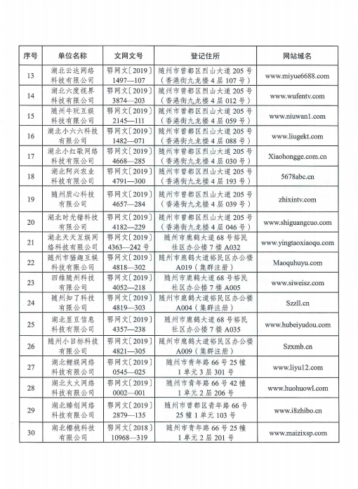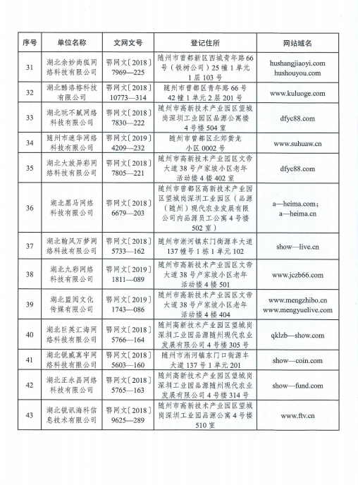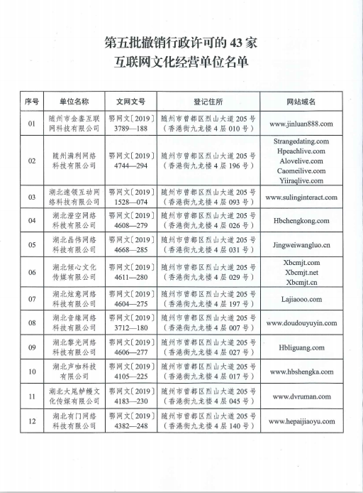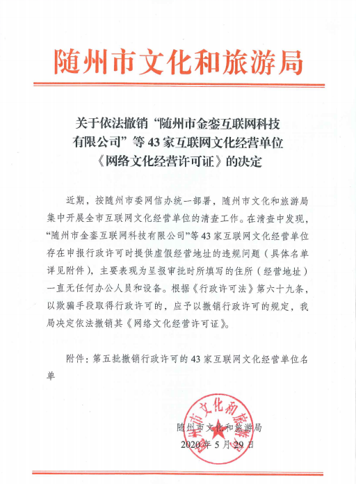 關于依法撤銷“隨州市金鑾互聯網科技有限公司”等43家互聯網文化經營單位《網絡文化經營許可證》的決定》