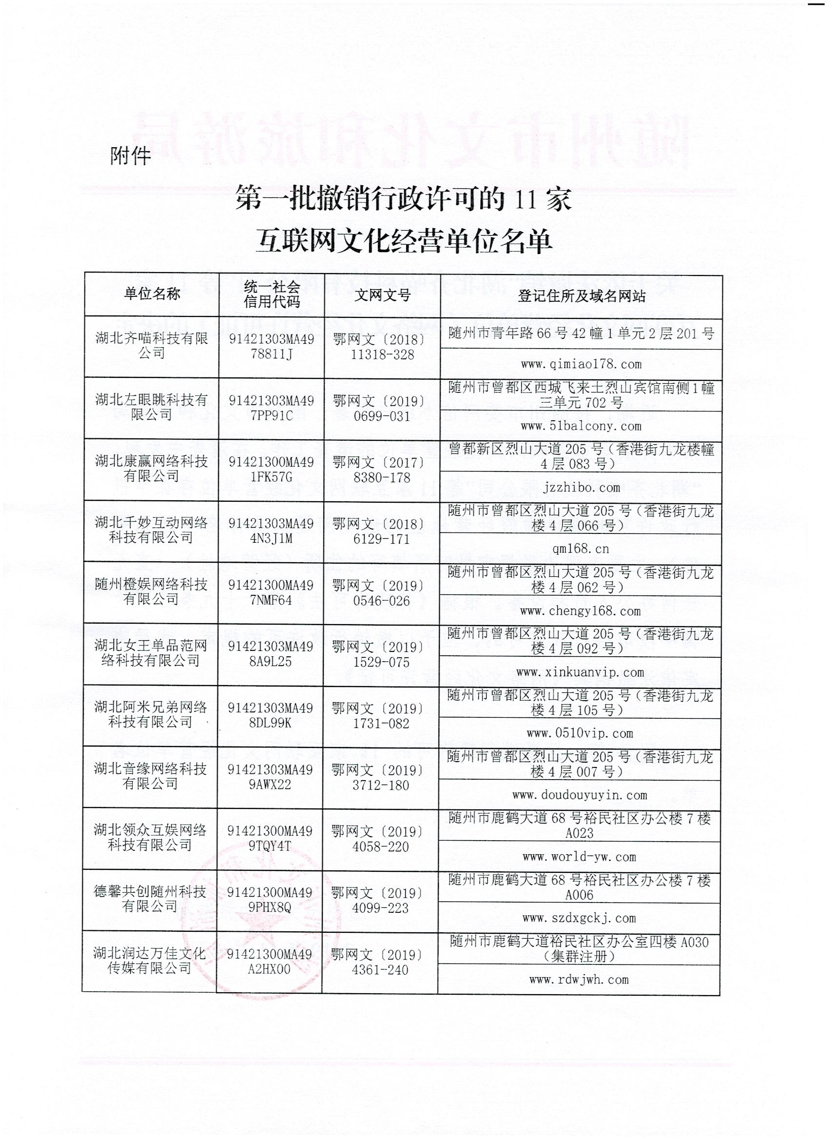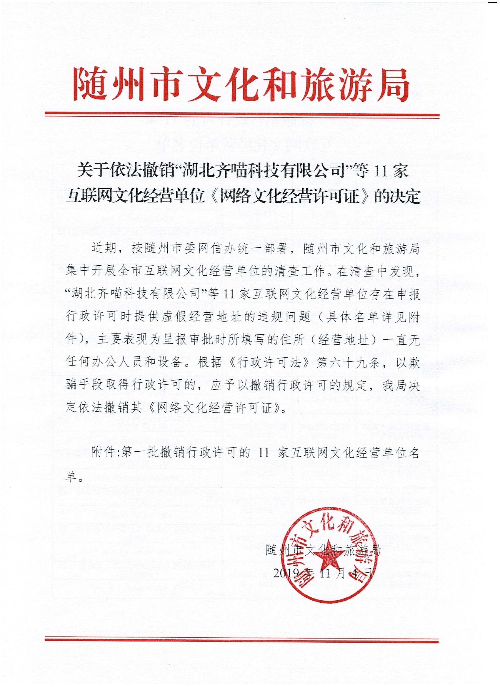 關(guān)于依法撤銷”湖北齊喵科技有限公司“等11家互聯(lián)網(wǎng)文化經(jīng)營(yíng)單位《網(wǎng)絡(luò)文化經(jīng)營(yíng)許可證》的決定