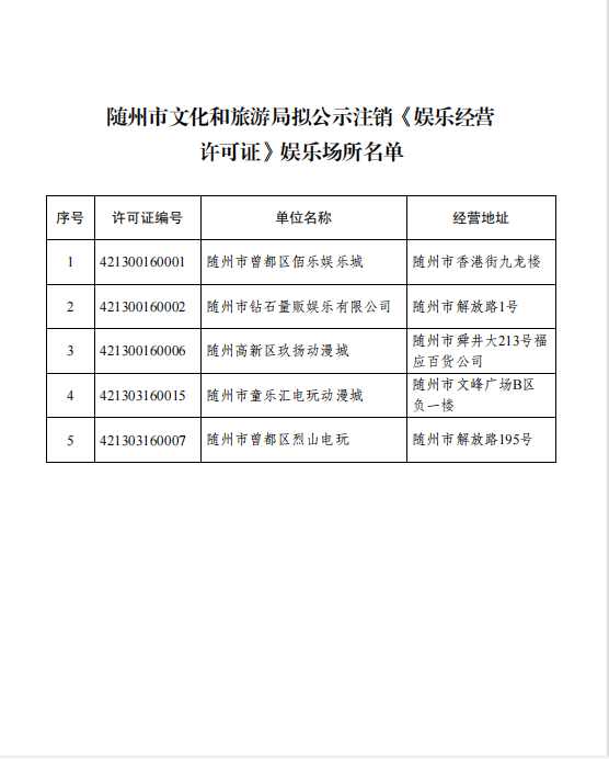 擬注銷《娛樂經(jīng)營許可證》的娛樂場(chǎng)所公示