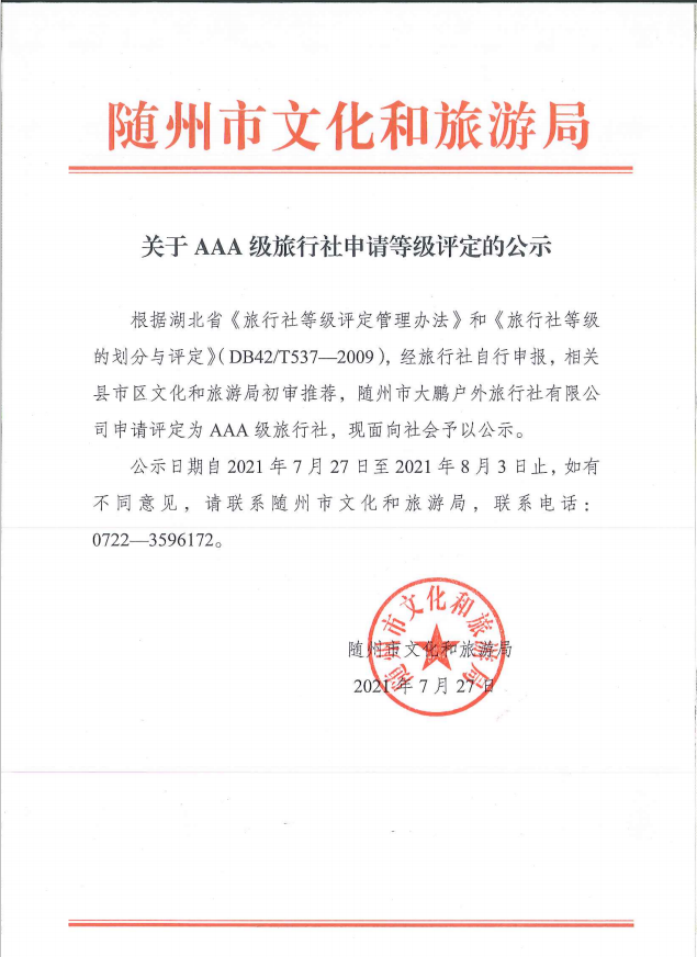 關(guān)于aaa級(jí)旅行社申請(qǐng)等級(jí)評(píng)定的公示