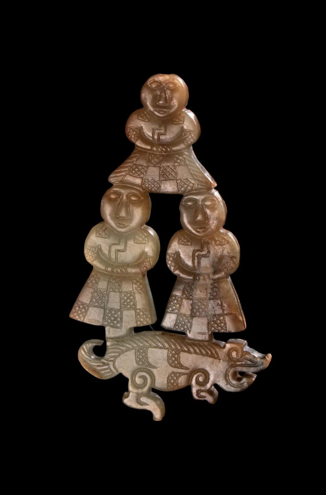 三人踏獸玉飾,約300 BCE,戰國中晚期