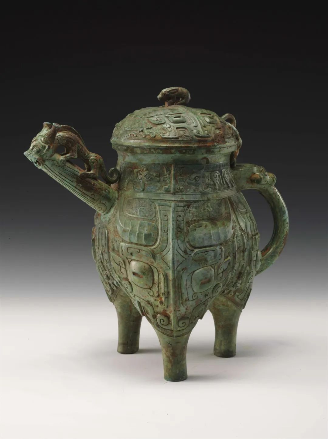 該器物出自西周早期曾國國君曾侯諫之墓,比聞名世界的曾侯乙墓要早500年左右。這件銅盉是西周時期的主要禮器之一,用來盛放酒水。全器滿飾多層紋樣和飾物,華美精湛,并且充滿巧思:壺嘴處的爬獸與流口巧妙地結合在一起,壺蓋上的兔形鈕也充當了把手。
