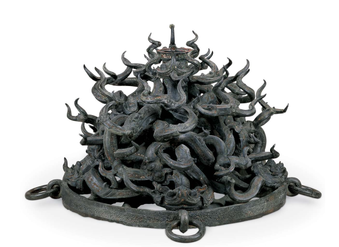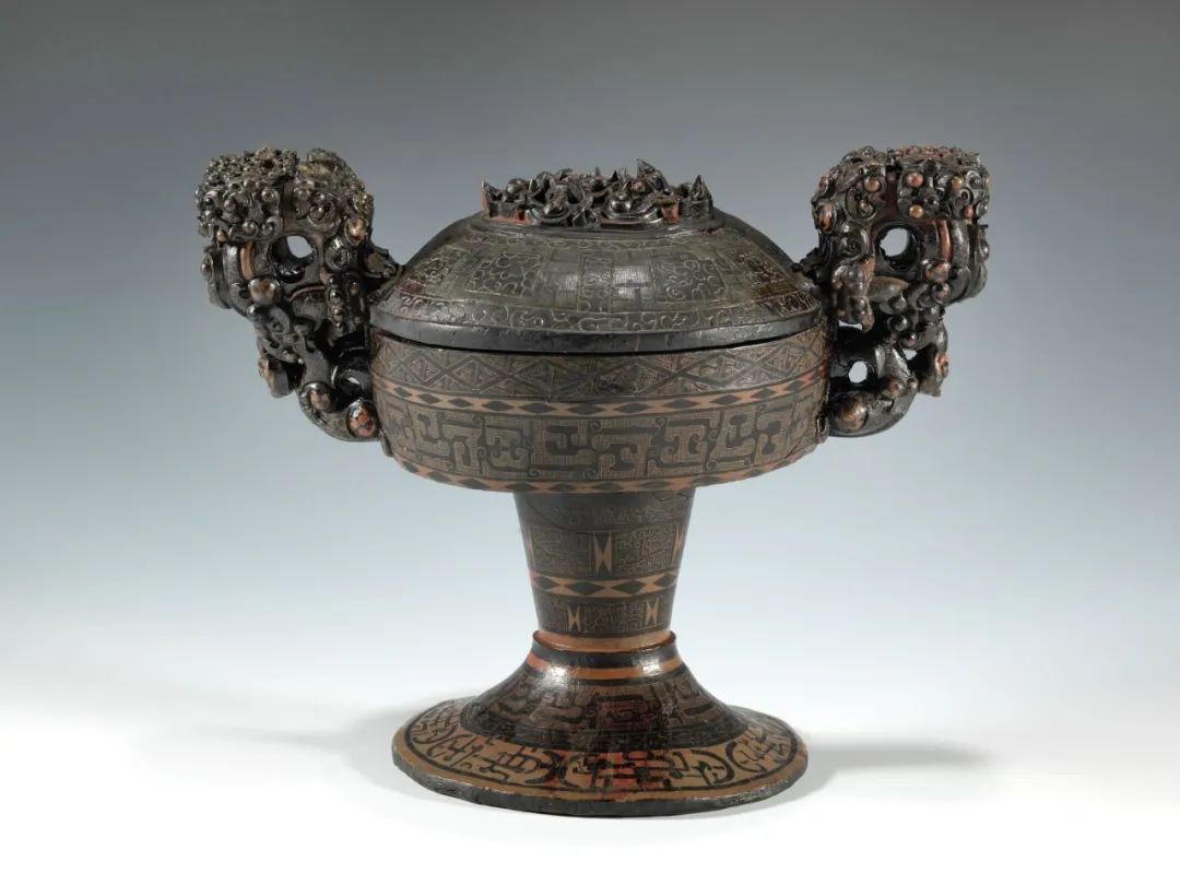 這件由蓋與豆組成的漆器是戰國時期漆木雕刻工藝的巔峰之作,也是當時漆器作品模仿青銅器創作的潮流典范。它由六個部分組成,最為突出的特點是蓋上精細雕刻的游龍和仿制青銅器上龍形裝飾的手柄。