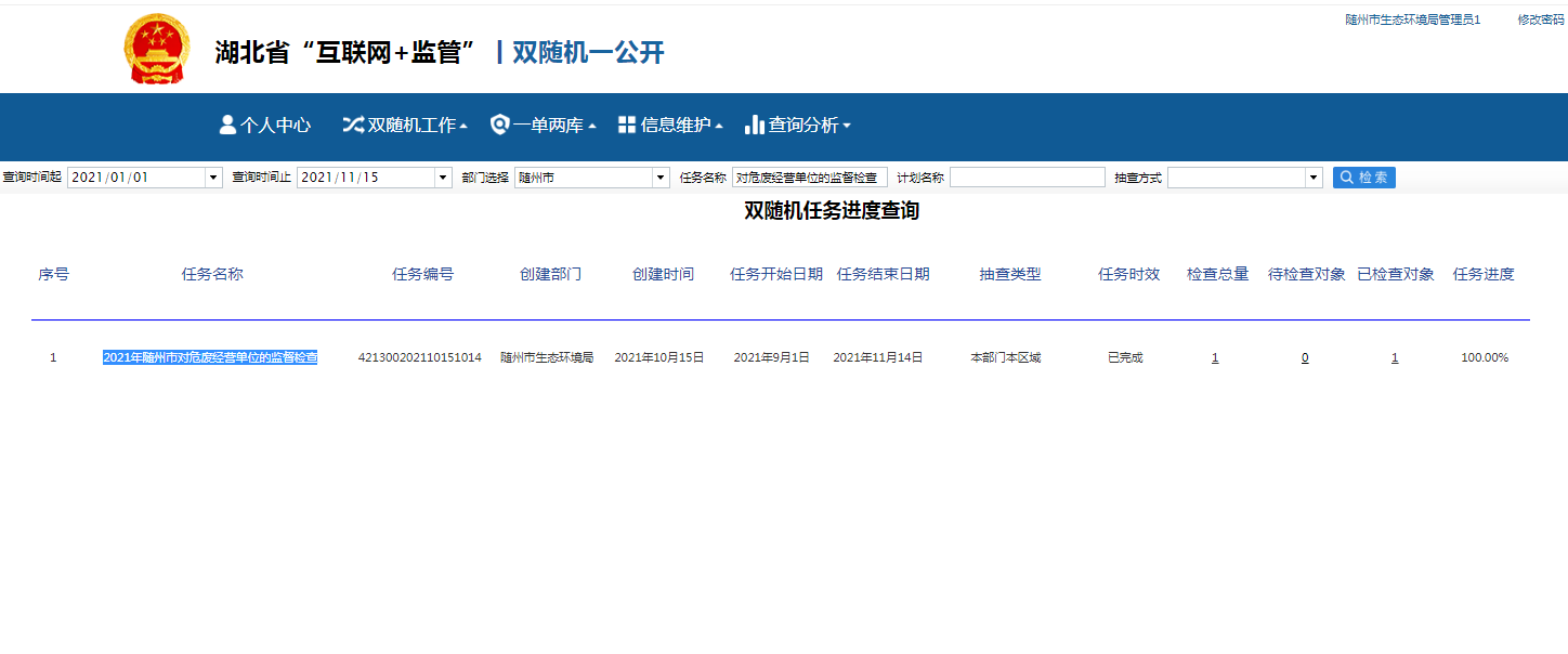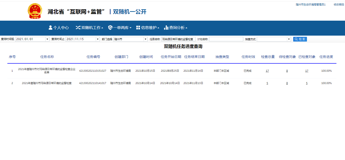 2021年隨州市生態環境局“雙隨機、一公開”本部門雙隨機抽查任務完成截圖