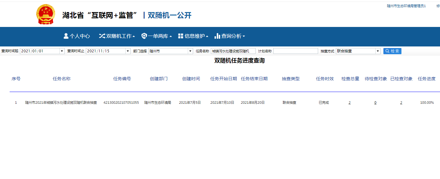 2021年隨州市生態(tài)環(huán)境局“雙隨機(jī)、一公開(kāi)”部門(mén)聯(lián)合抽查任務(wù)完成截圖