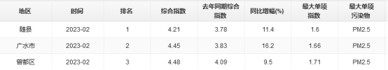 2023年2月,隨州市空氣監測數據:可吸入顆粒物(PM10)平均濃度值為76μg/m3,較去年同期升高13.4%;細顆粒物(PM2.5)平均濃度值為60μg/m3,較去年同期升高20.0%;二氧化硫(SO2)平均濃度值為6μg/m3,較去年同期降低33.3%;二氧化氮(NO2)平均濃度值為26μg/m3,較去年同期升高30.0%;一氧化碳(CO)第95百分位值為1.0mg/m3,較去年同期降低9.1%;臭氧(O3)8小時最大值日第90百分位值為108μg/m3,較去年同期降低12.2%。