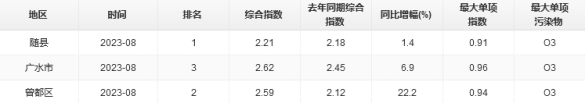 2023年8月,隨州市空氣監(jiān)測(cè)數(shù)據(jù):可吸入顆粒物(PM10)平均濃度值為33μg/m3,較去年同期升高3.1%;細(xì)顆粒物(PM2.5)平均濃度值為23μg/m3,較去年同期升高91.7%;二氧化硫(SO2)平均濃度值為6μg/m3,較去年同期升高20.0%;二氧化氮(NO2)平均度值為9μg/m3,較去年同期升高28.6%;一氧化碳(CO)第95百分位值為0.8mg/m3,較去年同期無變化;臭氧(O3)8小時(shí)最大值日第90百分位值為150μg/m3,較去年同期升高8.7%。