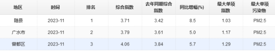 2023年1-11月,隨州市空氣監測數據:可吸入顆粒物(PM10)平均濃度值為58μg/m3,較去年同期升高11.5%;細顆粒物(PM2.5)平均濃度值為40μg/m3,較去年同期升高25.0%;二氧化硫(SO2)平均濃度值為7μg/m3,較去年同期無變化;二氧化氮(NO2)平均濃度值為16μg/m3,較去年同期無變化;一氧化碳(CO)第95百分位值為1.0mg/m3,較去年同期降低9.1;臭氧(O3)8小時最大值日第90百分位值為146μg/m3,較去年同期降低6.4%。