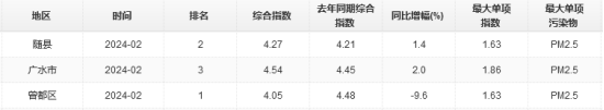 2024年2月,隨州市空氣監測數據:可吸入顆粒物(PM10)平均濃度值為71μg/m3,較去年同期降低6.6%;細顆粒物(PM2.5)平均濃度值為58μg/m3,較去年同期降低3.3%;二氧化硫(SO2)平均濃度值為8μg/m3,較去年同期升高33.3%;二氧化氮(NO2)平均濃度值為13μg/m3,較去年同期降低50.0%;一氧化碳(CO)第95百分位值為1.0mg/m3,較去年同期無變化;臭氧(O3)8小時最大值日第90百分位值為114μg/m3,較去年同期升高5.6%。