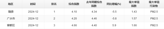 2024年12月,隨州市空氣監測數據:可吸入顆粒物(PM10)平均濃度值為76μg/m3,較去年同期降低1.3%;細顆粒物(PM2.5)平均濃度值為58μg/m3,較去年同期升高1.8%;二氧化硫(SO2)平均濃度值為9μg/m3,較去年同期升高12.5%;二氧化氮(NO2)平均濃度值為35μg/m3,較去年同期升高20.7%;一氧化碳(CO)第95百分位值為1.2mg/m3,較去年同期無變化;臭氧(O3)8小時最大值日第90百分位值為92μg/m3,較去年同期升高10.8%。
