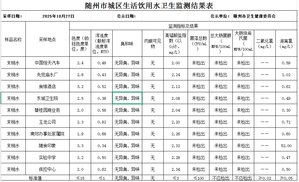 【生活用水監測信息.圖表】10.27隨州市城區生活飲用水衛生監測結果公示