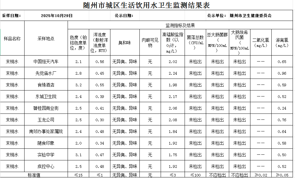 【生活用水監測信息.圖表】10.29隨州市城區生活飲用水衛生監測結果公示